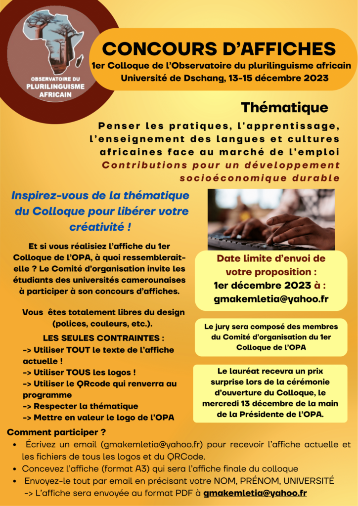 Et si vous réalisiez l’affiche du 1er Colloque de l’OPA, à quoi ressemblerait-elle ? Le Comité d’organisation invite les étudiants des universités camerounaises à participer à son concours d’affiches. Le lauréat recevra un prix surprise lors de la cérémonie d’ouverture du Colloque, le mercredi 13 décembre de la main de la Présidente de l’OPA.